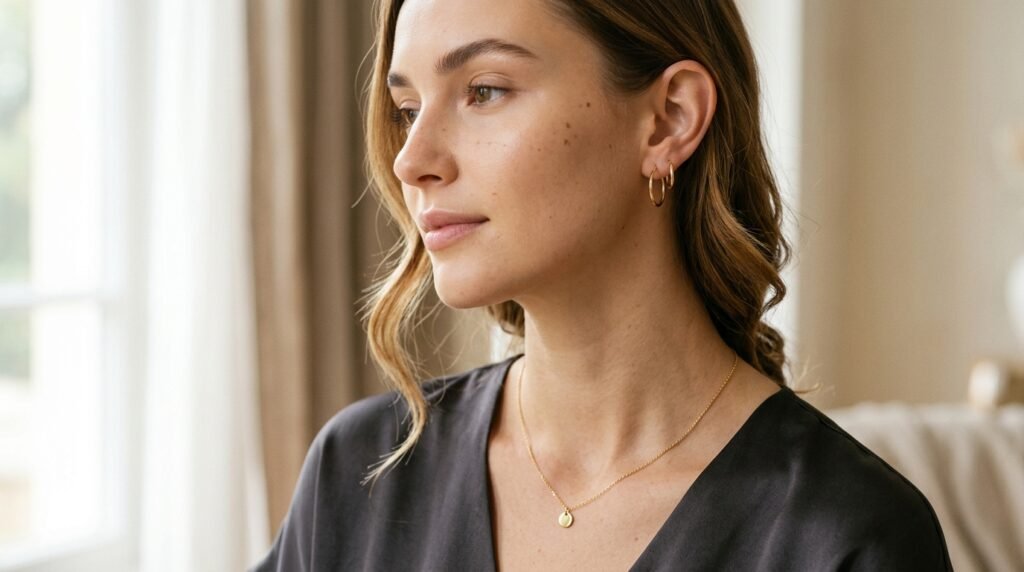 Minimal jewelry is delicate and gives a touch of minimal luxury. Understated rings, small hoops or thin chains are the best. Avoid overly flashy designs. When it is less detailed, it can give the impression of being a premium.