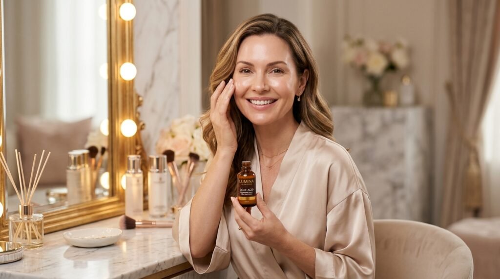 Kojic acid, which comes from fermented Japanese rice wine, effectively dissolves melanin clusters that produce age spots. The product serves as a fundamental component in skin brightening products which deliver a flawless porcelain finish to the complexion.
