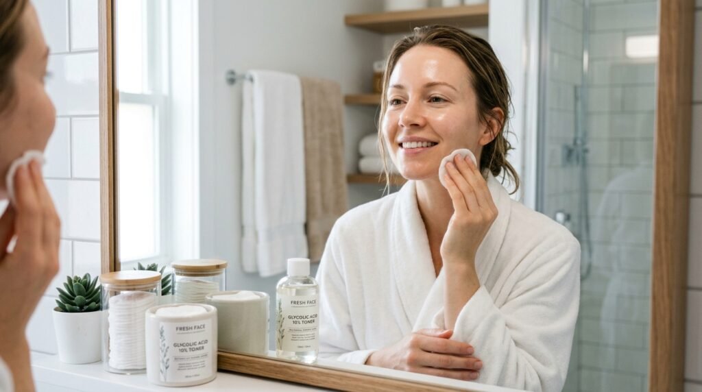 The acid functions as a skin exfoliant which removes dead skin cells that create an ashen appearance on your skin. Using a 5% glycolic toner twice a week provides skin benefits comparable to a facial which instantly improves facial skin texture.