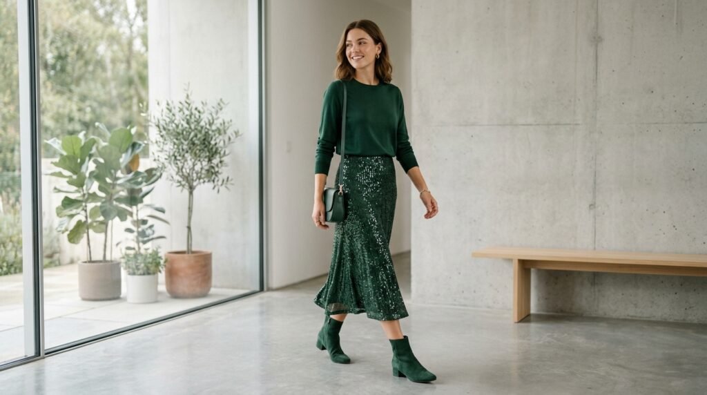 Wearing one color family all over your outfit could give a very smooth and slim effect. When your top, skirt, and shoes are in the same shades, the sequins bring an added depth of texture instead of a distinct, loud piece.