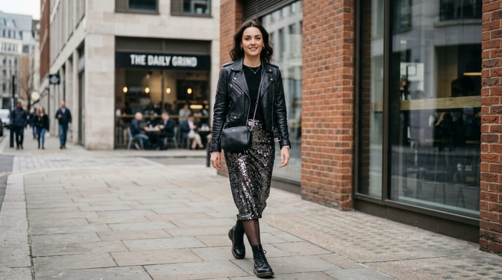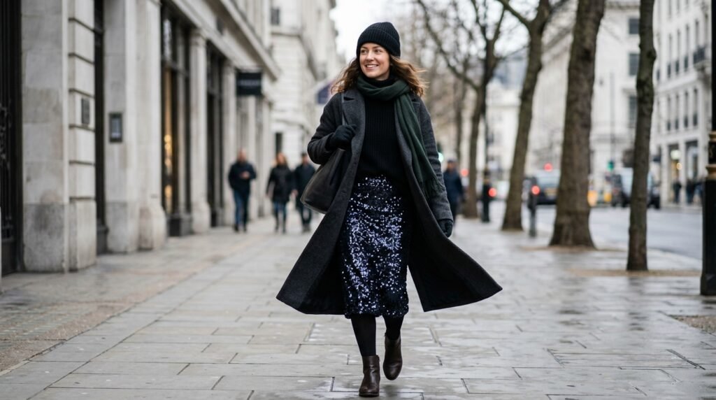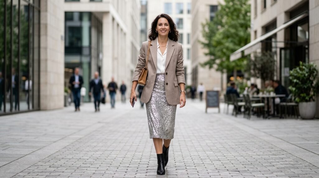 A well-crafted blazer can immediately transform a sequin dress into something that appears more sophisticated. This combination usually has a good effect when you select neutral colors since the tailoring will give some order and professionalism to the whimsical character of the shimmering fabric.