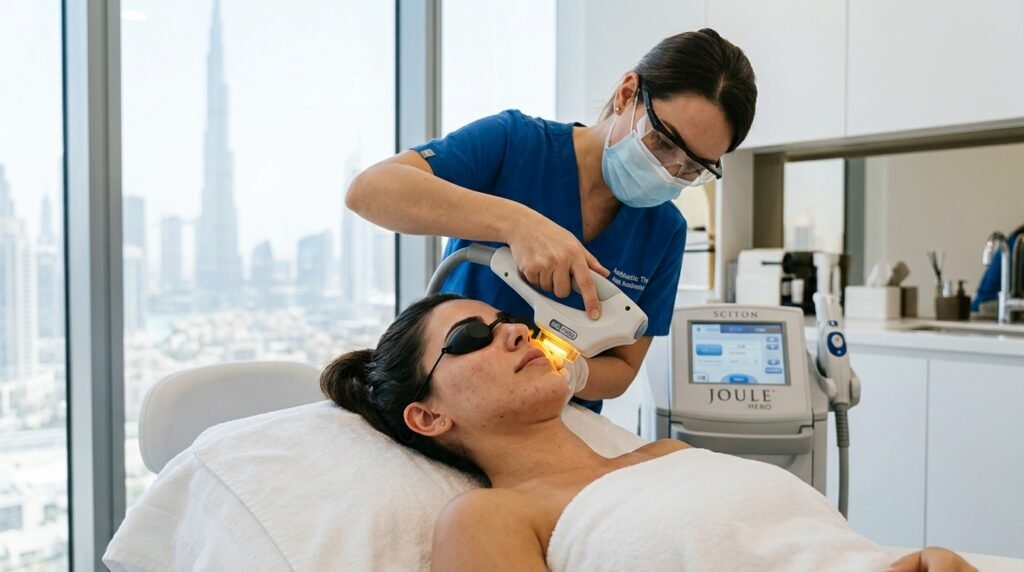 The light therapy provides fast results because it eliminates “reds and browns” from the skin, which includes both broken capillaries and sunspots. The treatment provides skin tone correction to Dubai residents who spend time outdoors because it promotes long-term collagen production while creating an even skin tone.