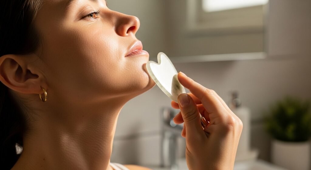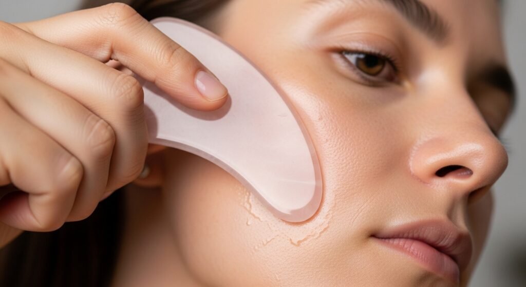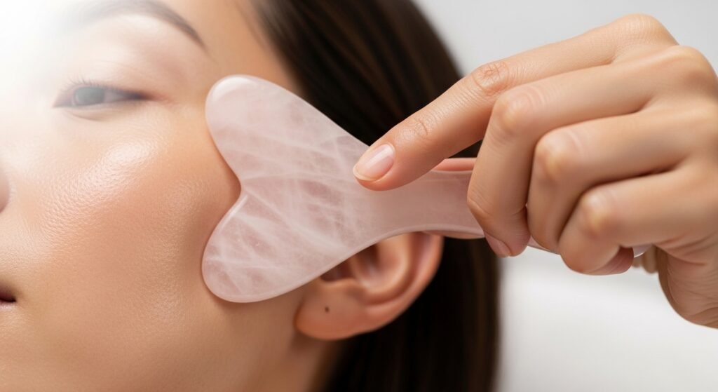 The gua sha tool is usually curved in its edges and could be shaped to different areas of the face. The tool should be held very close to the skin in low angle. This helps create a flowing gliding motion than pounding the periphery on the skin.