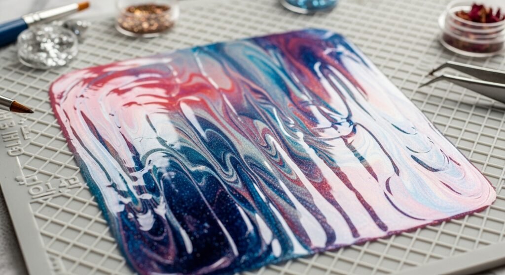 Apply a type of nail polish (crystal clear or any color you want) on a plain pieces of plastic or silicone mat. Let it dry partially then it will become both soft and not completely hard. It will be the staple of your custom wraps.