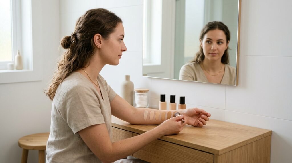 A good number of us apply foundation on our arms, yet the skin there seldom matches our face or neck. Such a habit can result in the feared floating head in photos. The shade test on the jawline is usually a better method of making sure that the shade is perfect and invisible.