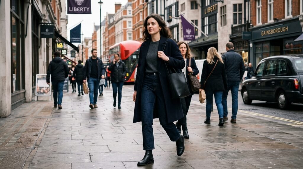 London style is very often characterized by the impeccable tailoring of garments with casual parts. The deeper shade of denim sort of reflects this equilibrium, on the one hand, being a very formal thing and, on the other hand, making one feel that it is very easy to wear and use for a day in the city.