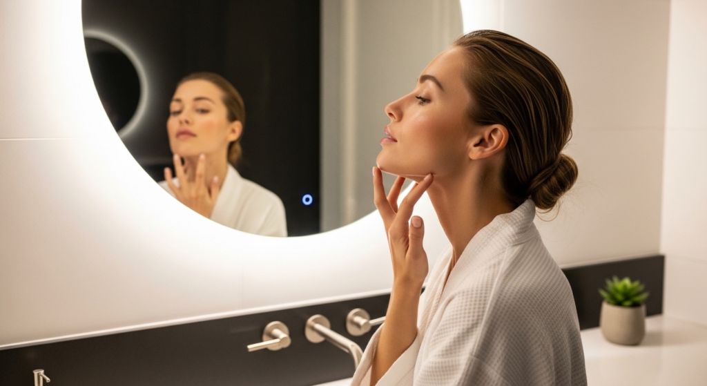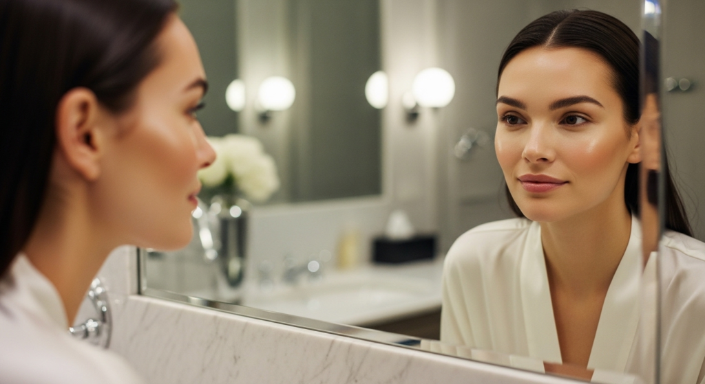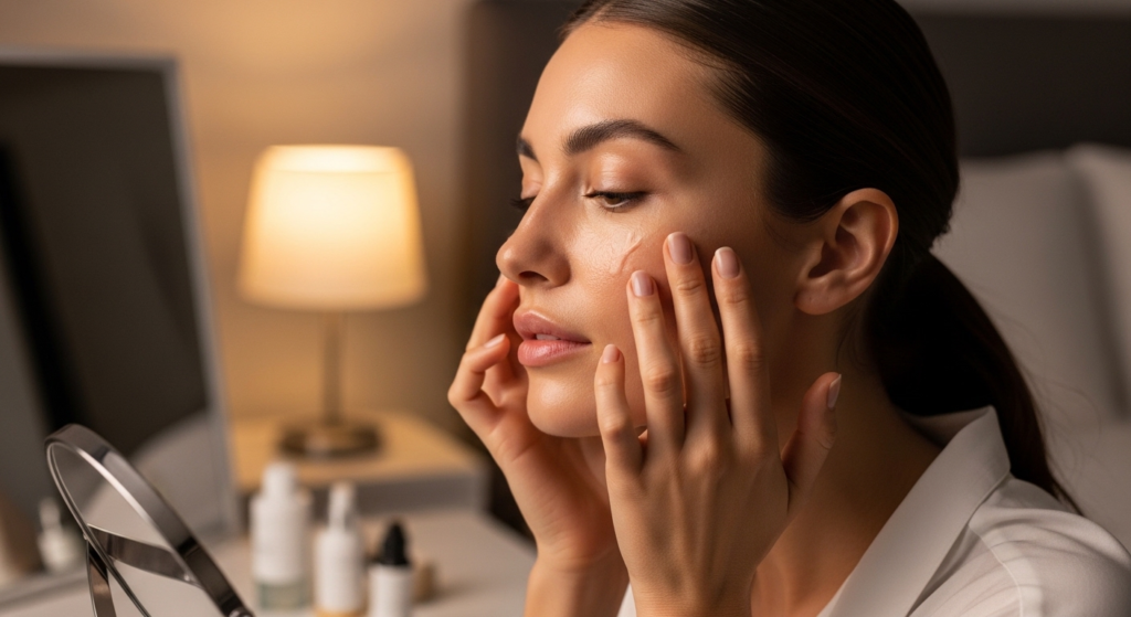 Glowing morning skin starts with evening hydration rather than morning products. A serum containing hyaluronic acid is used on hydrated skin with a barrier that seals the hydration reservoir overnight, transforming the skin’s appearance by dawn.