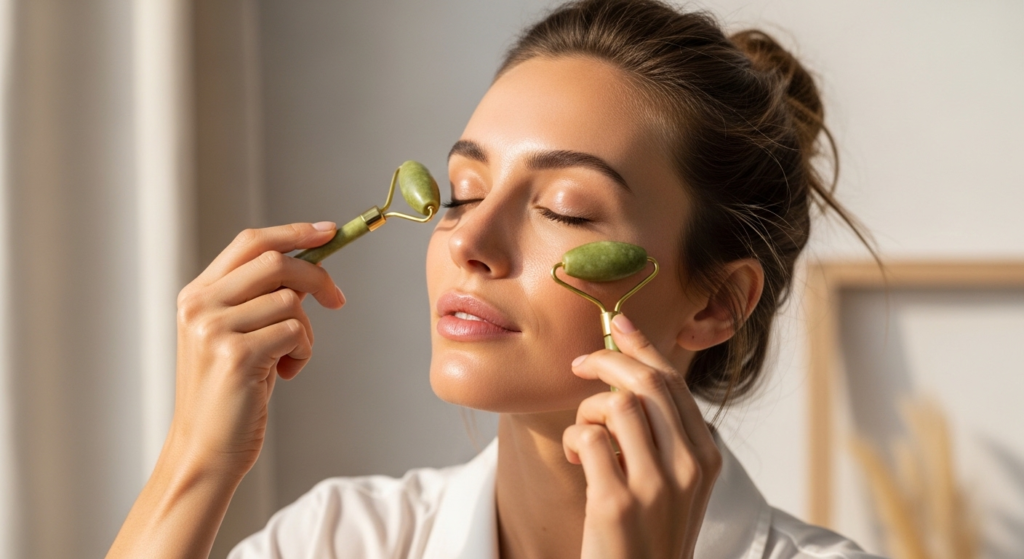 One upward-facing three minutes of jade roller or gua sha facial massaging enhances lymphatic drainage, de-puffiness in the morning, and circulation in the skin to provide instant natural glow and the real radiance that no highlighter ever reaches.