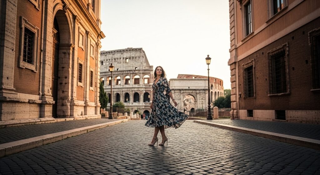 Rome has become a permanent element of her “heels” fashion style and she demonstrates her ability to walk through cobblestone streets which lead to the Colosseum by showing how historical sites create an everlasting sophisticated ambiance which resembles a functioning art museum with architectural masterpieces.