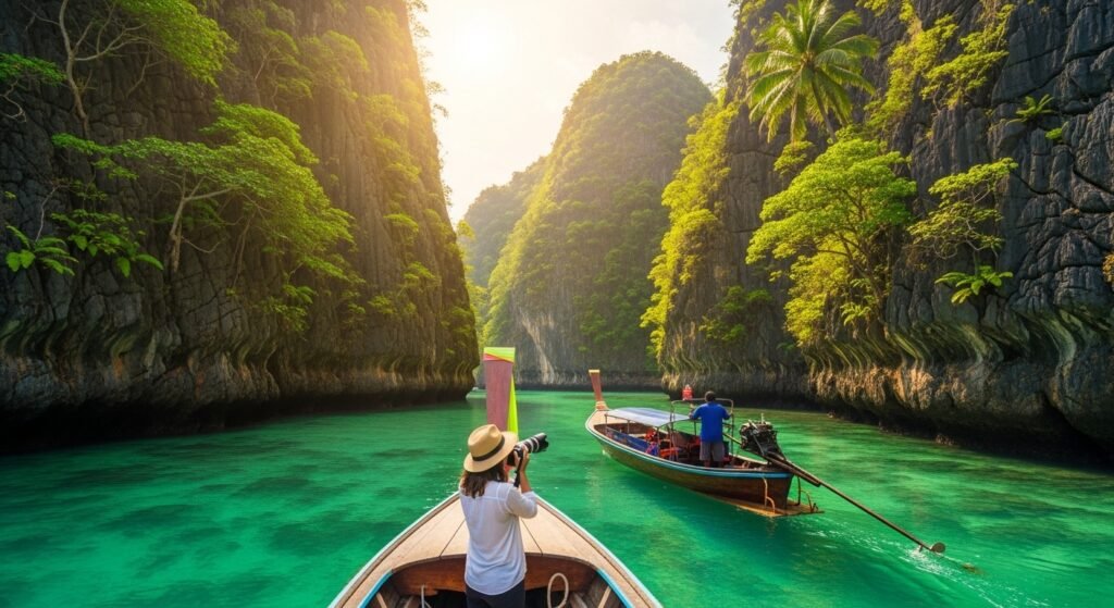 She explored Thailand’s hidden lagoons and limestone karsts and she recommends her followers to experience boat trips which take them to secret sea caves through emerald waters because this activity provides both adventure and hidden beauty.
