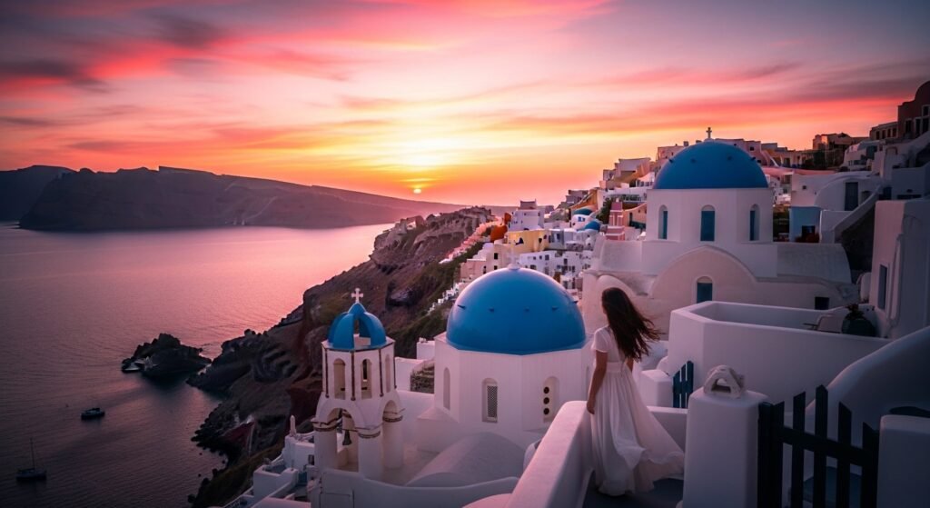 Her brand naturally matches Oia’s famous white-washed buildings and blue domes. Aegean sunsets create their most colorful display when they turn the caldera into a pink and purple pigment display.