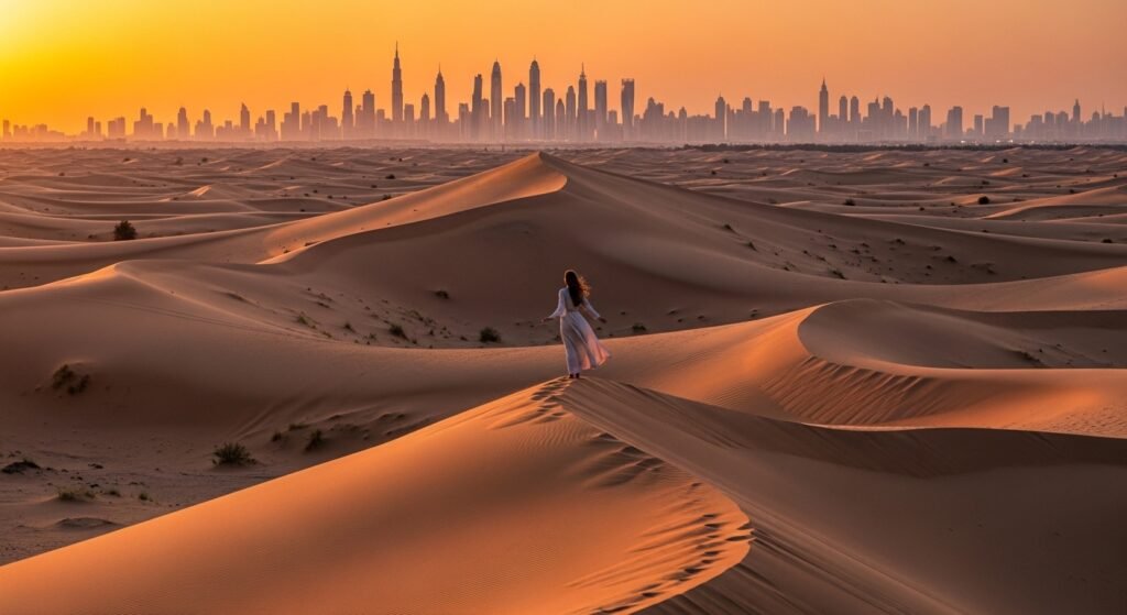 The Dubai desert serves as her main residence while she uses it as her primary location. She demonstrates how sunset creates peaceful golden beauty through its extensive sand dunes which transform into an opposing force against the city’s contemporary skyline.