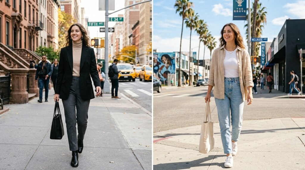 New York required tailoring to fit, whereas Los Angeles required California casual. It took as little as a book of neutrals and the desire to add accessories in different ways to fit both the aesthetics in one carry-on, balsa-like bag, and demonstrates the fact that less really does pack better.
