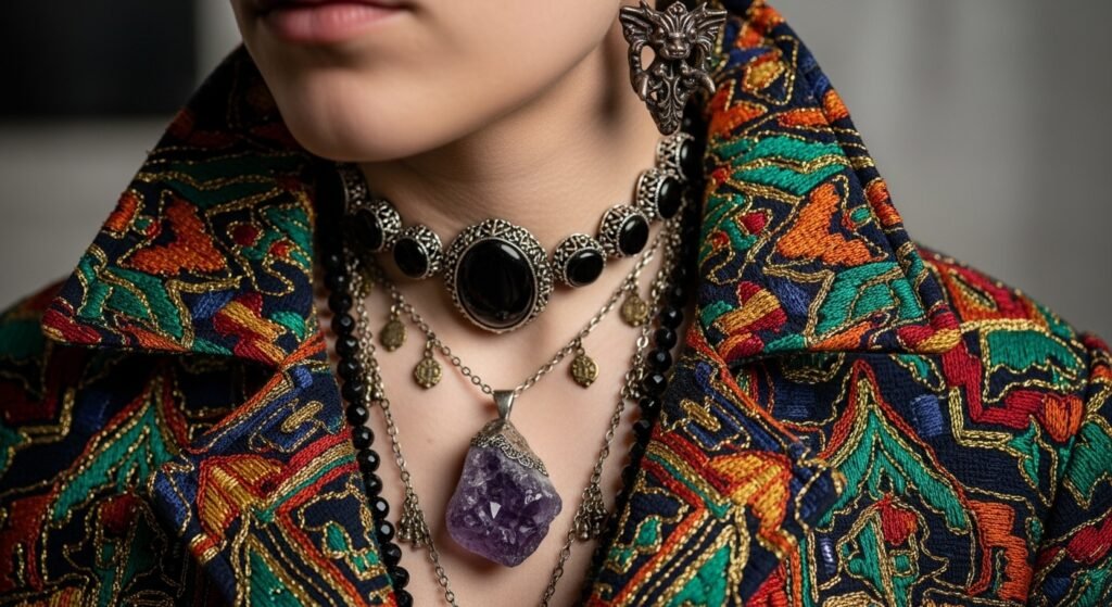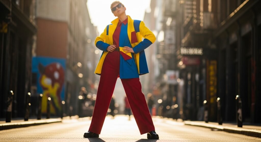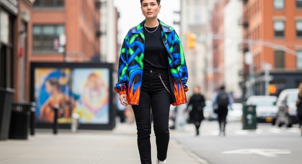 Even the most straightforward clothes can be something to remember with the addition of one striking piece, such as a bright jacket or something unusual.