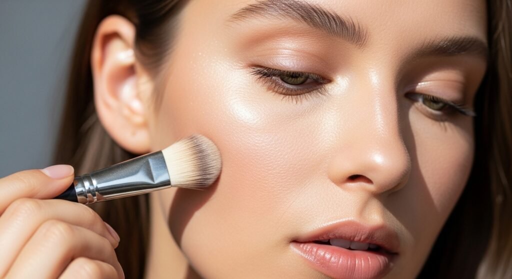 A light highlighter is applied rather than dramatic shimmer to bring about a lightening effect. It is applied sparsely over the cheekbones and the bridge of the nose and does not seem to overpower the appearance.