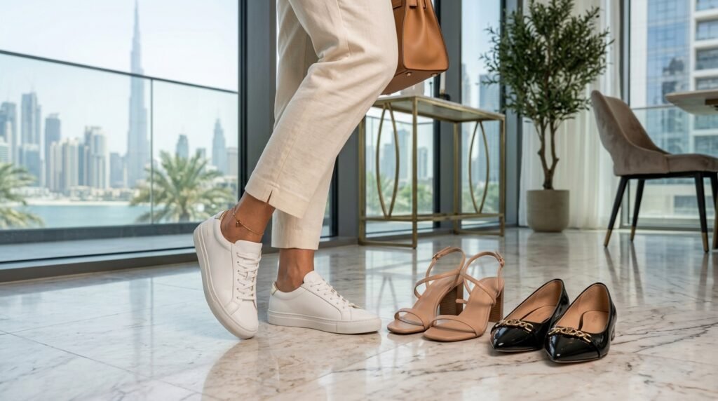 Shoes change everything. Ninety percent of Dubai life is well managed by white trainers, which are clean, heeled sandals, and one pair of classic pointed flats. Shoes never come as an afterthought; they are the full period of any outfit.